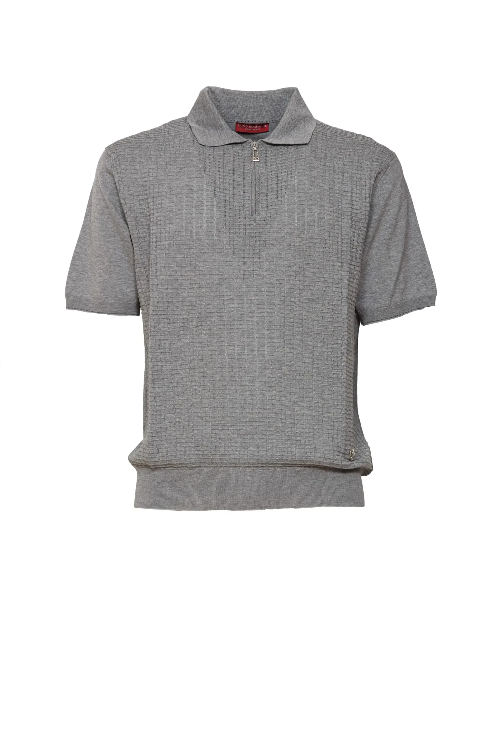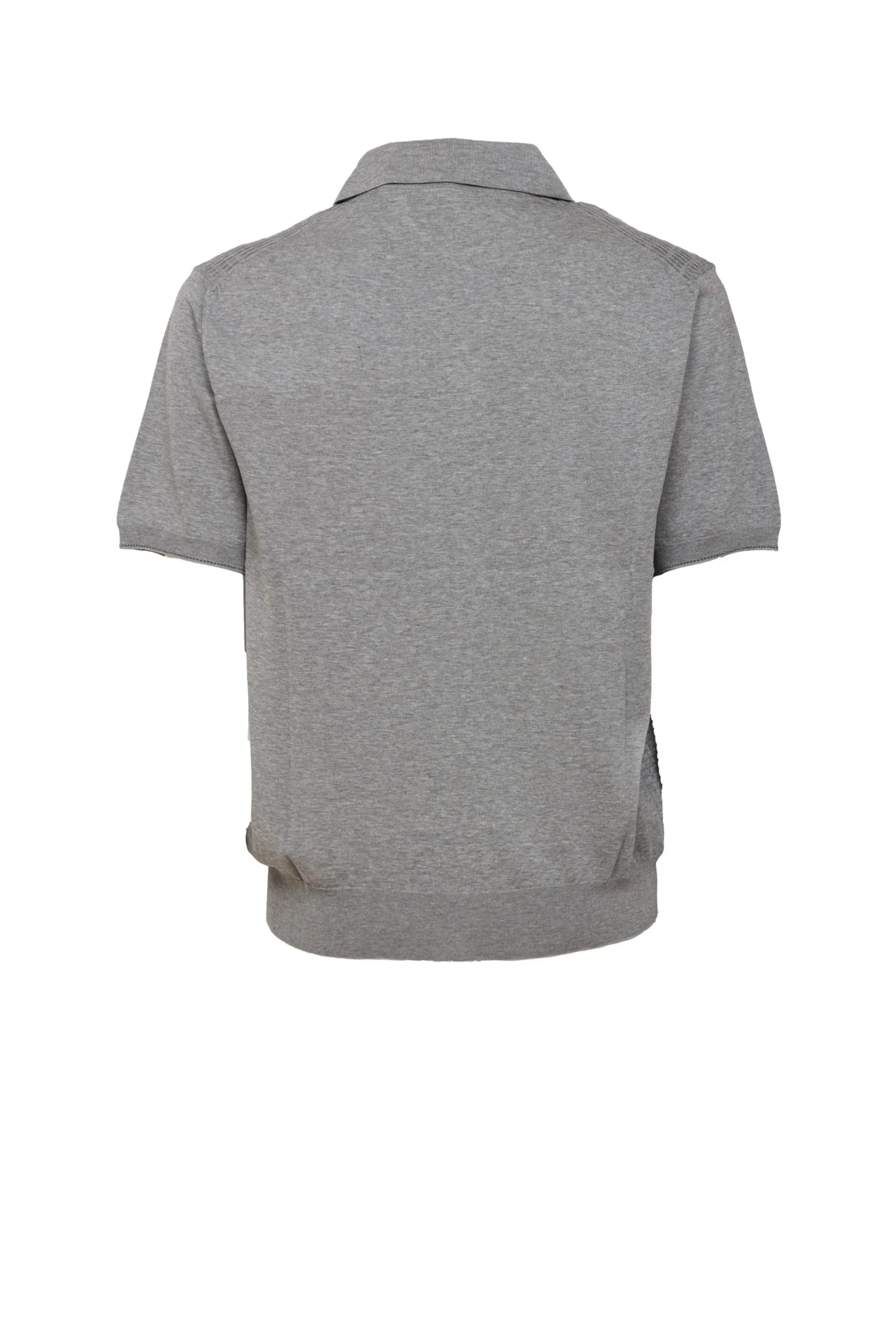 - 这款浅灰色短袖半拉链针织衫线条简洁,前幅采用细致纹理织法,并配以金属质感拉链。